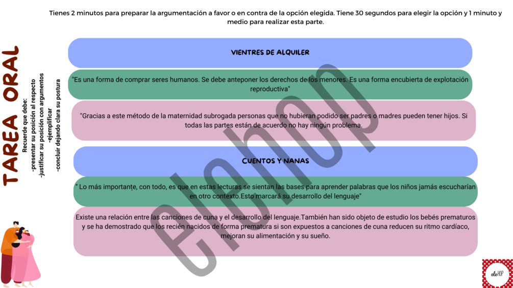 Se proponen actividades de producción escrita y oral (Ejercicios de producción oral basados en el examen Siele con temas de actualidad como la crianza y la gestación subrogada).